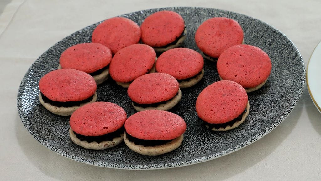 POHJAT: Vaahdota huoneenlämpöiset valkuaiset. Lisää tomusokeri. Vatkaa edelleen, kunnes seos on kiiltävää. Yhdistä mantelijauhe ja perunajauhot keskenään. Sekoita valkuaisvaahtoon lastalla pyöräyttäen. Värjää puolet taikinasta punaiseksi. Pursota pellille ja anna levätä hetki. Paista uunin keskiosassa 150 asteessa 13 - 15 min.