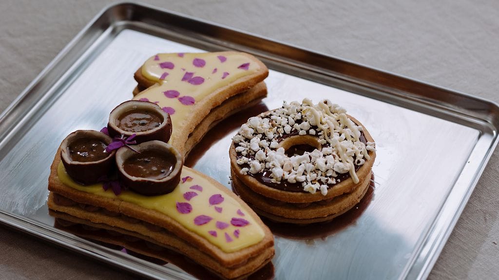 KAKKU 1 – PASSIONHEDELMÄ: Halkaise passionhedelmät ja ota hedelmäliha pois. Paseeraa. Laitat paseerattu passionhedelmä, sitruuna, keltuaiset ja sokeri kattilaan. Keitä kasaan. Lisää lopuksi voi. Sekoita tasaiseksi ja jäähdytä.