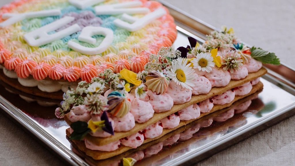 MARENKITÄYTE: Vaahdota kananmunan valkuaiset sokeri. Värjää elintarvikeväreillä. Pursota pieniä marenkikoristeita leivinpaperin päälle, uunipellille. Kuivata uunissa.