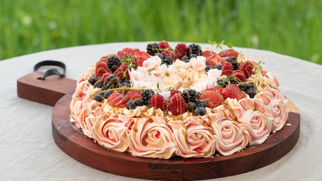 Vatkaa valkuaiset kovaksi vaahdoksi. Sekoita maissijauhot ja vaniljasokeri sokeriin ja lisää seosta vähän kerrallaanvalkuaisvaahtoon jatkaen vatkaamista niin, että lopputulos on kovaa ja kiiltävää. Sekoita joukkoon etikkaa ja vatkaa vielä hetki. Piirrä leivinpaperiin halkaisijaltaan n. 25-30cm:n ympyrä. Levitä lusikalla kerros valkuaisvaahtoa ympyrän reunoille.Pursota muutama pikkumarenki lisäksi. Nostele reunoille loppu vaahto ja nostele sitä hieman, että syntyy huippuja. Muotoile vielä keskikohtaa, että siihen jää kuoppa täytettä varten. Paista pohjaa 120 asteisessa uunissa 1.5-2 tuntia, kunnes pinta on oljenvaalea ja sisus kuin vaahtokarkkia. Anna jäähtyä.
