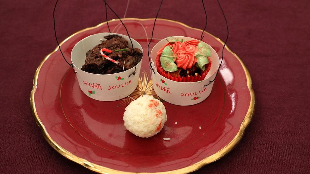 Sulata 150 g valkosuklaata. Yhdistä hiukan tomuväriä kookoshiutaleiden kanssa. Pyörittele pallot suklaassa ja sitten kookoshiutaleissa. Laita jääkaappiin jähmettymään.