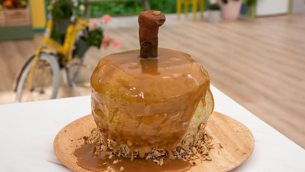 KAKUN KOKOAMINEN JA VIIMEISTELY: Tasoita kakkupohjien pinnat ja laita ensimmäinen Ø 15 cm kakkupohja tarjoiluastialle. Kostuta pohja sitruunasiirapilla. Pursota reunalle sitruunakreemiä. Levitä kreemin keskelle tyrniomenasosetta. Pursota soseen päälle ohut kerros sitruunakreemiä. Laita päälle toinen Ø 15 cm kakkupohja ja toista kakun täyttö. Seuraaviin kerroksiin tulee leveämmät Ø 18 kakkupohjat. Muista kostuttaa myös viimeinen kakkupohja. Työnnä kakun läpi 3 kpl kakkutukea. Viilennä jääkaapissa. Sahaa terävällä veitsellä muotoa vielä enemmän omenaa muistuttavaksi. Lisää kreemistä paksuhko murukerros ja tasoita epäkohdat. Ota pistaasimarsipaanista 50 g pala erilleen ja vaivaa siihen kaakaojauhe. Muotoile siitä omenan ruoti ja työnnä sen sisälle kakkutuki. Anna kovettua kylmässä. Kauli loput marsipaanista leivonta-alustan päällä. Öljyä tarvittaessa alusta ja lisää maissitärkkelystä, jotta kauliminen helpottuu. Nosta 3 mm paksuinen marsipaanilevy kylmän kakun päälle. Tasoita varovasti kakun pintaa ja pyri saamaan vekit pois hennosti marsipaania venyttämällä. Sivele tomusokeri-vesiliima omenan alareunaan. Nostele reunoille saksanpähkinärouhetta. Aseta omenan ruoti paikoilleen. Aseta leivosrengas paikoilleen siten, että se ei pääse vuotamaan. Kaada kinuski renkaan sisälle. Nosta rengas ylös näytösmäisesti herkuttelijoiden läsnä ollessa.