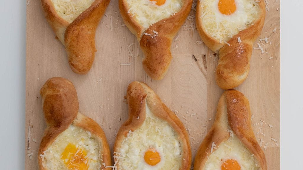 OHJE: Valmista taikina sekoittamalla vehnäjauhot, munat, hiiva ja kermaviili keskenään. Vaivaa, kunnes taikina on elastinen ja tasainen. Kelmuta taikina ja anna levätä 20 minuuttia. Kauli taikinasta kuusi soikean muotoista palaa ja aseta juustot keskelle. Ala rullata taikinaa joka reunasta tasaisesti, kunnes saat veneen muodon. Voitele reunat munalla. Paista 200 asteessa kullanruskeaksi. Riko viiriäisen muna keskelle leipää ja paista vielä muutama minuutti. Viimeistele parmesaanilla.