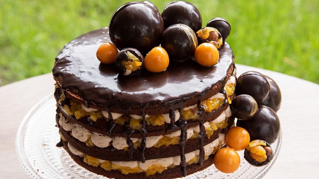 KORISTELU JA VIIMEISTELY: Pilko aprikoosit ja pähkinät pieneksi. Temperoi suklaa. Sivele suklaata erikokoisiin puolipallomuotteihin: Ø 6 cm, Ø 5 cm, Ø 4 cm ja Ø 2,8 cm. Käännä muotti ylösalaisin ja valuta ylimääräinen suklaa pois. Varmista, että suklaata on tasaisesti kaikkialla muotissa. Lisää vielä tyhjien Ø 2,8 cm puolipallomuottien pohjalle pähkinärouhetta ja aprikoosin paloja. Kaada suklaata muotin yläreunaan saakka. Vedä spaattelilla ylimääräinen suklaa pois muottien pinnasta ja laita jääkaappiin kovettumaan. Irrota varovasti. Lämmitä tyhjä kattila liedellä. Sulata siinä puolipallojen reunat yksitellen ja liitä yhteen. Liitä pähkinöitä ja aprikoosia sisältävä puolipallo pelkän puolipallokuoren kanssa yhteen. Asettele pallot kakun päälle ja osa reunalle. Aloita isoimmista palloista. Käytä apuna sulaa suklaata ja suklaan jäähdytyssuihketta. Lisää lopuksi ananaskirsikat.