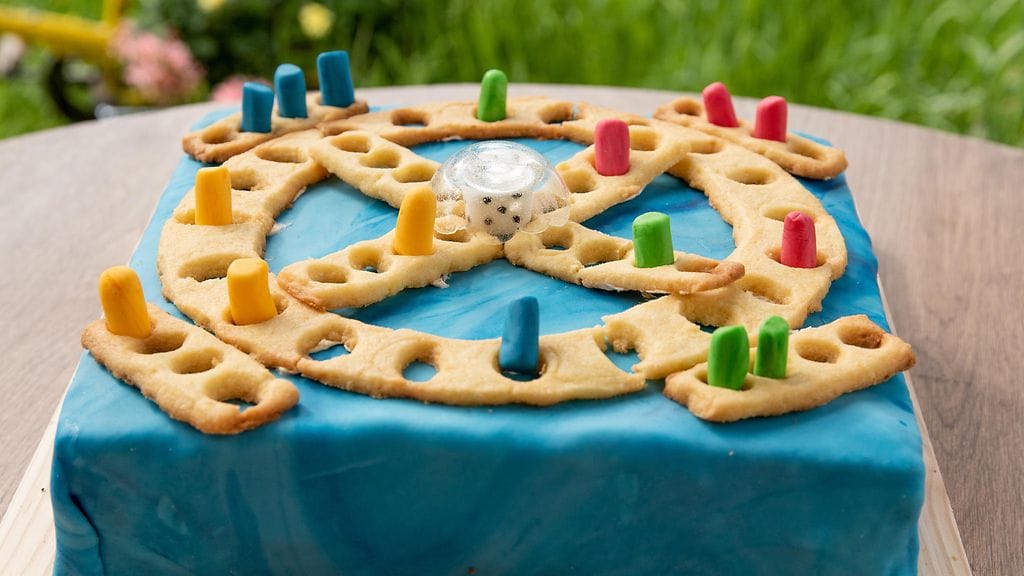 Asettele keksit kakun päälle, liimaa varovaisesti elintarvikeliimalla kiinni. Asettele pelinappulat haluamillesi paikoille. Nosta isomaltoosista tehty kulho keskelle kakkua, laita noppa sisään.