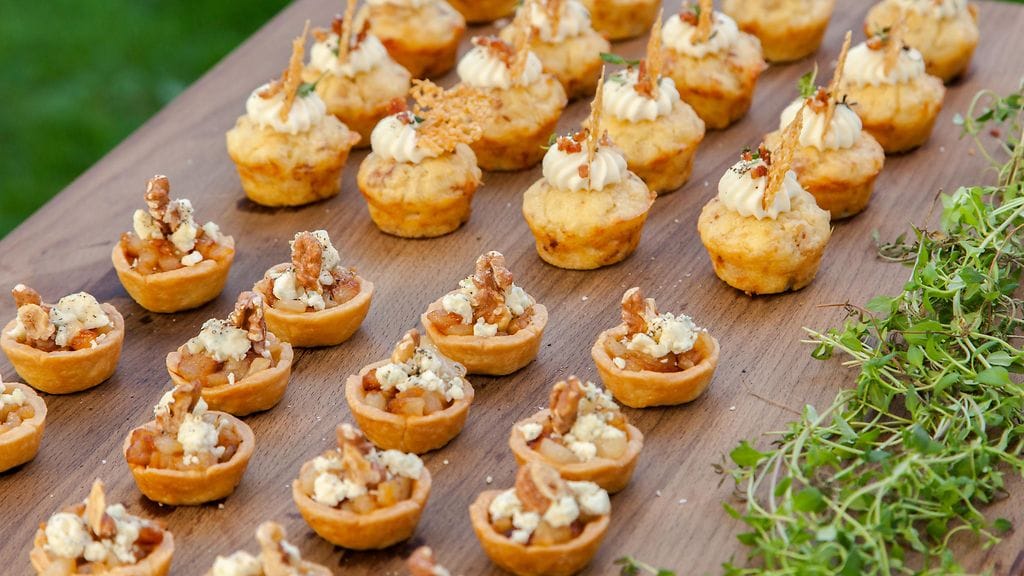 2. Valmista muffinitaikina: lämmitä oliiviöljy paistinpannussa ja paista pekonisilppua, kunnes rasva alkaa sulaa. Lisää sipuli ja paista miedolla lämmöllä, kunnes sipuli ruskistuu. Anna jäähtyä. Sulata voi varovasti pienessä kattilassa miedolla lämmöllä ja jätä jäähtymään. Sekoita jauhot, leivinjauhe ja suola ja siivilöi taikinakulhoon. Tee jauhojen keskelle syvennys. Sekoita jogurtti ja maito keskenään. Lisää jauhojen keskellä olevaan syvennykseen sulatettu voi, kananmuna ja keltuainen sekä jogurtti-maitoseos. Sekoita nopeasti suurella lusikalla tai lastalla taikinaksi. Sekoita vain muutama sekunti! Kääntele joukkoon pekoni, sipuli ja juustoraaste. Jaa taikina minimuffinipeltiin.