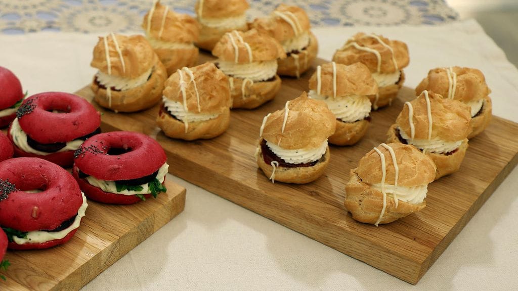TUULIHATTUJEN VALMISTUS: Mittaa kattilaan voi ja vesi. Kuumenna seosta ja anna voin sulaa. Kiehauta seosta kunnolla. Lisää seokseen vehnäjauhot ja kypsennä seosta samalla sekoittaen, kunnes taikina irtoaa kattilan reunoilta. Nosta kattila pois liedeltä ja anna jäähtyä hetki. Lisää hieman jäähtyneeseen massaan munat ja vatkaa huolellisesti käsivatkaimella. Lisää lopuksi leivinjauhe ja jatka vatkaamista hetken ajan. Pursota taikinasta leivinpaperin päälle 12 samankokoista tuulihattua (halkaisijaltaan noin 3cm). Paista 200°C uunin keskitasolla noin 25 minuuttia. Uuninluukkua ei saa avata paiston aikana! Anna jäähtyä.