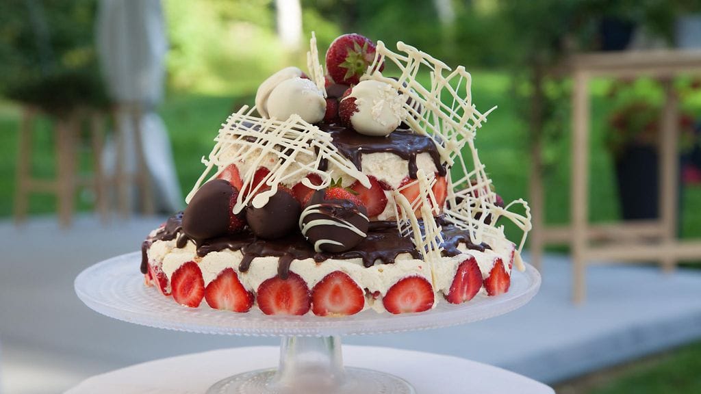 11. Valmista koristeeksi tulevat mansikat mousselinen viilentyessä: temperoi valkosuklaa omassa kattilassaan ja tumma suklaa omassaan. Kasta mansikoita temperoiduissa suklaissa ja aseta jähmettymään cocktailtikkujen päähän niin, että työnnät kunkin tikun mansikkoineen kiinni isoon siivilään. Ripottele kookoshiutaleita ja rouhittua valko- sekä tummaa suklaata muutamien suklaamansikoiden pinnalle ennen kuin suklaapinta jähmettyy. Viilennä mansikoita hetki viileässä. Koristele loput mansikoista raidoittamalla niitä ylijääneillä temperoiduilla suklailla. Siirrä mansikat viileään odottamaan kakun koristelua.