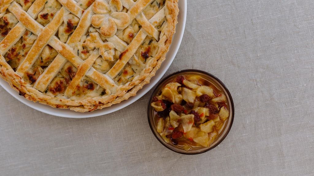 CHUTNEYN VALMISTUS: Kuori ja kuutioi omenat. Poista chilistä siemenet ja hienonna. Kaada kattilaan sokeri ja etikka. Kiehauta ja lisää omenat, sitruunan kuori, rusinat ja sinappi. Keitä noin 10 minuuttia. Jäähdytä. Tarjoile erillisessä astiassa piirakan kanssa.