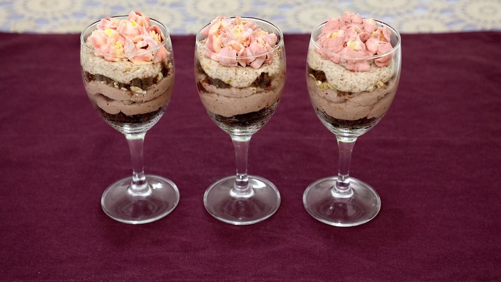 Vaahdota kerma ja rahka. Lisää suklaa ja liivate. Pursota tasaisesti kermaa leivoksiin ja aseta kirsikat. Laita leivokset hetkeksi pakastimeen.
