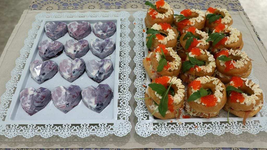 Lisää täytteen päälle kinkku, raastettu juusto, rucola. Viimeistelee pelastusrenkaat valkoisella vispikerma-tuorejuusto vaahdolla. Aseta kaviaari niin, että tuulihatut näyttävät pelastusrenkailta.