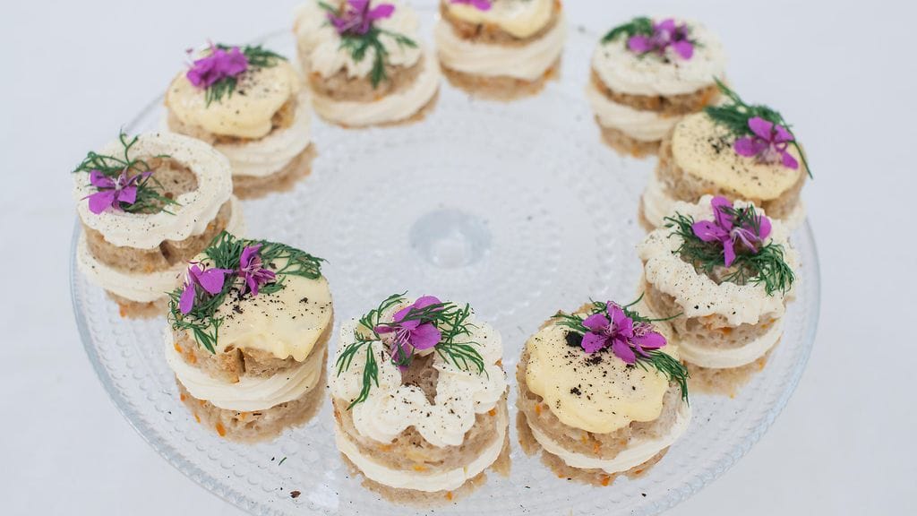 LEIVOSTEN VALMISTUS: Leikkaa leivästä 1 cm paksuisia siivuja. Leikkaa siivuista halkaisijaltaan 6 cm olevalla ympyrämuotilla ympyröitä 30 kpl. Kostuta ympyrät hyvin vesi-sitruunamehu seoksella. Kokoa leivokset kolmikerroksisiksi siten, että ensiksi pursota 0,5 cm halkaisijaltaan olevalla pyörötyllalla (wilton 10) aitaus leipäympyrän päälle. laita sitten aitauksen sisään täytettä. Toista sama toisessa kerroksessa. Kuorruta leivoksen, pursottamalla pienellä tähtityllalla ( wilton 22). Koristele leivokset tillillä, ja lohesta pyöritetyillä ruusuilla.