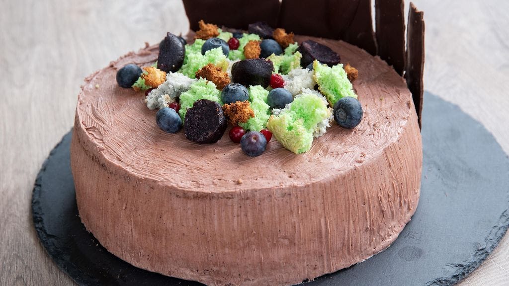 POHJA: Voitele ja korppujauhota kaksi kakkuvuokaa (halkaisija 20cm). Vaahdota kananmuna ja sokeri. Yhdistä kuivat aineet keskenään ja lisää siivilän läpi kananmuna-sokerivaahtoon. Kääntele varovasti joukkoon nuolijalla. Jaa ¾ osa taikinasta halkaisijaltaan 20cm kakkuvuokiin. Jaa loppu taikina 3 osaan. Värjää yksi vihreällä, yksi mustalla ja kolmas ilman väriä. Kaada massat creme brulee vuokiin (halkaisija 8,5cm ja syvyys 4,5cm) tai muihin pieniin leivinpaperilla vuorattuihin vuokiin. Paista isoin kakku 200c 20min, tarkista kypsyys esim. cocktailtikulla. Jäähdytä pohja. Paista pienemmät vuoat 200c 15min, tarkista kypsyys cocktailtikulla. Jäähdytä pohjat.