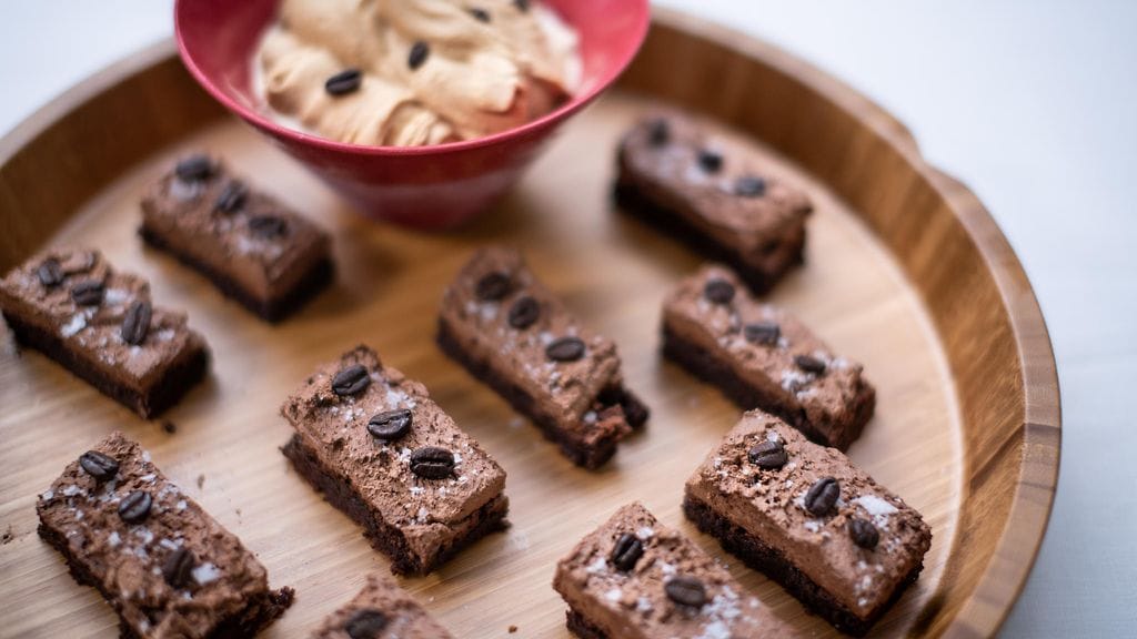 BROWNIE: Vuoraa uunivuoka leivinpaperilla ja voitele se pehmeällä voilla. Anna voin sulaa pienessä kasarissa erittäin miedolla lämmöllä, niin ettei pääse kiehahtamaan. Ota levyltä ja sekoita joukkoon paloiteltu suklaa sekä vaniljauute. Jäähdytä. Sekoita kulhossa vehnäjauho, kaakaojauhe ja espressopikakahvijauhe. Yhdistä toisessa kulhossa sokerit ja kananmunat. Vaahdota vatkaimella suurella nopeudella noin 5 – 8 minuuttia, kunnes vaahto on paksua, vaaleaa ja kiiltävää. Kaada jäähtynyt voi-suklaaseos vaahdon joukkoon ja sekoita lastalla käännellen. Siivilöi joukkoon jauhoseos ja kääntele lastalla tasaiseksi (älä sekoita liikaa). Kaada taikina vuokaan ja tasoita pinta. Paista uunin alatasolla noin 25 minuuttia (Brownie saa jäädä keskeltä pehmeäksi). Anna jäähtyä kokonaan vuoassa.