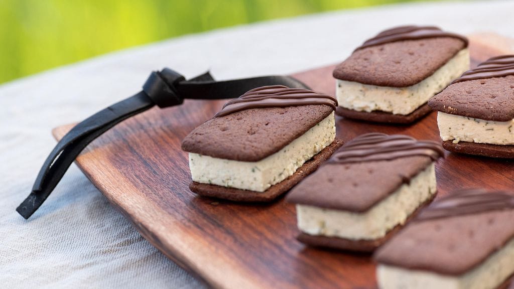 MINTTUJUUSTOKAKKU: Laita liivatelehdet likoamaan kylmään veteen. Vaahdota kerma. Lisää tuorejuusto. Perkaa mintusta lehdet erilleen. Mikäli yrtti on todella vahvaa, voi puolikas ruukkukin riittää. Jos yrtti on miedompaa, saa sen käyttää lähes kokonaan. Laita mintunlehdet ja kondensoitu maito blenderiin. Säästä muutama lehti koristelua varten. Hienonna seos tasaiseksi. Sulata valkosuklaa mikrossa (400W) 30 sekunnin pätkissä välillä sekoittaen, kunnes suklaa on täysin sulanut. Anna jäähtyä pari minuuttia. Lisää minttuseos ja jäähtynyt valkosuklaa kermaseoksen joukkoon. Kuumenna ¾ dl vettä mikrossa 30-60 sek ajan. Lisää joukkoon pehmenneet liivatelehdet. Anna jäähtyä hetki ja lisää liivate seokseen. Vuoraa noin 20x25cm vuoka kelmulla. Kaada juustokakkumassa vuokaan. Täyte saisi olla noin 1,5 cm korkea. Nosta vuoka pakkaseen vähintään tunniksi jähmettymään.