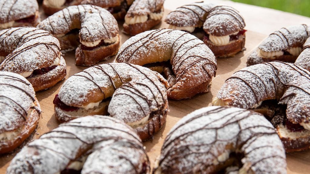 PRETZEL-TAIKINA: Yhdistä kuivat aineet. Lämmitä vesi 42 asteeseen ja lisää joukkoon puolet kuivista aineista. Lisää voi ja vaivaa joukkoon loput jauhoista. Taikina on valmista, kun se on sileää ja kimmoisaa. Öljyä taikinan pinta ja laita kelmun alle kohoamaan 30 minuutiksi. Jaa taikina 16 osaan ja pyörittele pulliksi. Taputtele ja kauli pulla ovaalin muotoiseksi. Laita toiselle reunalle kapea keksitaikinapötkö jarullaa kuten sikari. Taivuta päät sarven muotoon. Nosta öljyllä voidellulle leivinpaperille ja anna levätä kelmun alla 5 min.