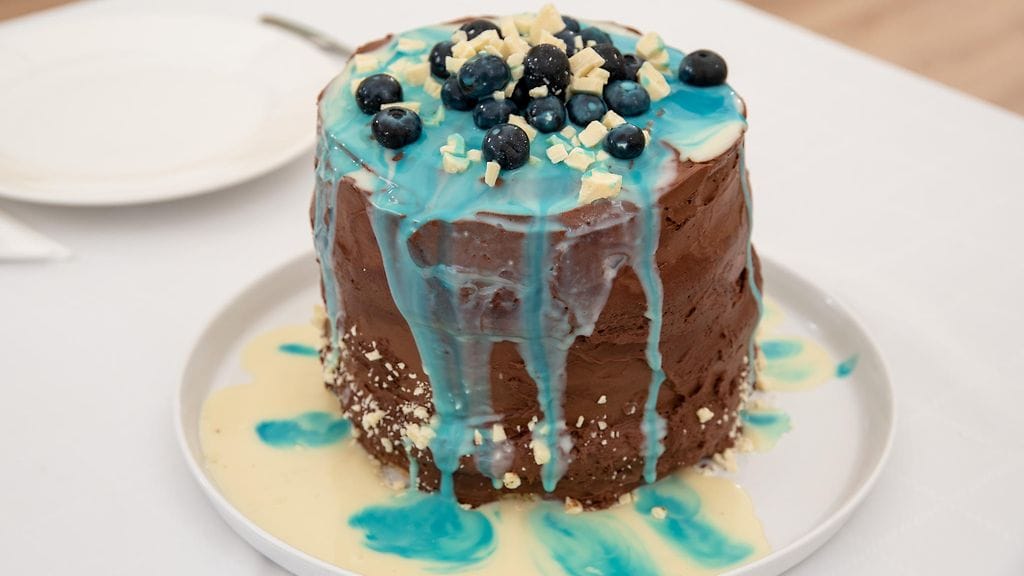 KAKUN VIIMEISTELY: Levitä suklaakreemi jähmettyneen kakun päälle ja reunoille. Tee reunakalvosta 2kpl pyöreää muottia, toinen hieman isompi ja toinen pienempi. Painele muotit kakun päälle sisäkkäin, tee veitsellä pieniä viiltoja kakun pintaan muotin mukaisesti, niin muotit varmasti uppoavat noin 0,5cm kakun sisään. Näin ne eivät falskaa, kun valuma kaadetaan niiden sisään. Kaada yksivärinen valuma ulompaan muottiin. Kaada siniseksi värjätty valuma keskelle, ripottele mustikoita sekä valkosuklaarouhetta värjätyn täytteen päälle. Poista ensin ulompi muotti, ja sen jälkeen sisempi.