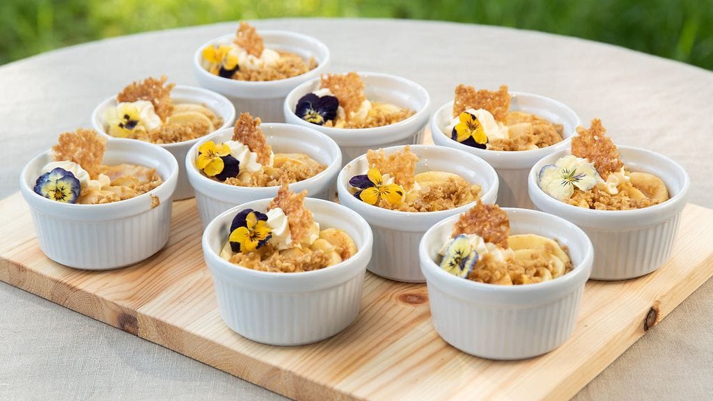 POHJA: Sekoita kaurahiutaleet, sokeri ja kaneli pannulla. Lisää voi ja paahda seosta pari minuuttia matalalla lämmöllä. Ota 10 kpl uuninkestävää vuokaa, joiden halkaisija on noin 10cm. Nosta 1-2 rkl seosta jokaisen vuoan pohjalle. Jätä kauraseosta noin 2 rkl koristelua varten.