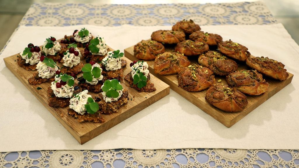 KORISTELUUN: Voitele kohonneet pullat ja ripottele päälle pistaasirouhetta. Paista 210-asteisessa uunissa n. 10-11 minuuttia.