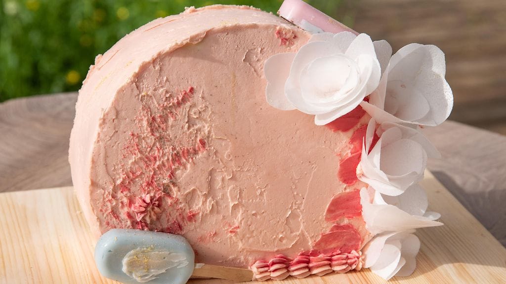 KAKUN KOKOAMINEN: Leikkaa kakkupohjat 2 osaan. Laita Kakkupohja tarjoiluastialle ja laita reunakalvo pohjan ympärille, kiinnitä teipillä. Lisää suklaamoussea 1/3 osaa ja lisää moussen päälle kinuskia. Laita uusi kakkupohja moussen päälle ja lisää jälleen mousse+kinuski ja toista tämä vielä kerran. Laita kakku jähmettymään. Leikkaa kakku puikkojäätelön muotoiseksi. Kaada kakku suora reuna kakkualustaa vasten. Levitä voikreemi kakun päälle. Laita kakku kylmään hetkeksi ja lisää sitten kakun pintaan tekstuuria käyttämällä pullasutia ja voikreemiä. Ota pullasutiin vähän voikreemiä päähän ja tupsuttele kakun pintaan pullasudilla. Lisää kukkia koristeeksi ja kakkujäätelöt kakun etupintaa vasten.