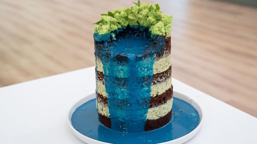 VIIMEISTELY: Hyytymisen jälkeen kaiverra vielä tarvittaessa kakun päällä olevaa koloa isommaksi tarvittaessa. Lisää toispuoleisesti korkeimpaan kohtaan syötävää sammalta. Kiinnitä ylimääräisellä minttumoussella. Lisää sekaan myös pieniä mintun lehtiä. Lisää ennen tarjoilua sininen putous-ganache kaiverrettuun koloon. Poista kalvo nostamalla ja päästä putous putoamaan.