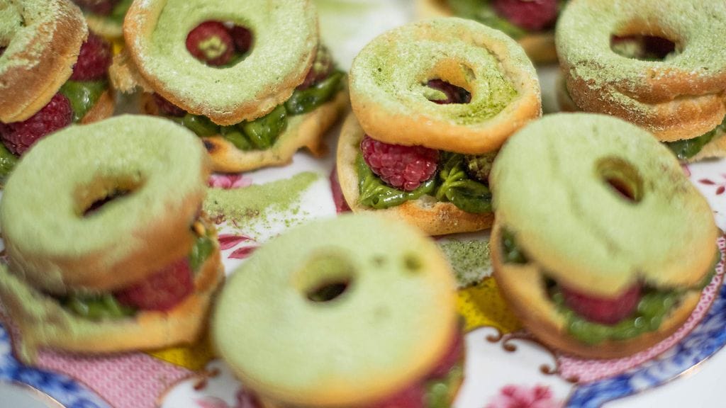 Jäähdytä. Leikkaa puoliksi. Täytä matcha-täytteellä sekä tuoreilla vadelmilla. Koristele tomusokerilla, johon olet sekoittanut hieman matchaa.