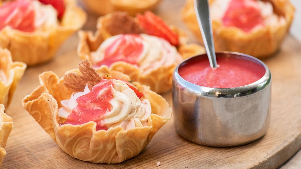 LEIVOSTEN TÄYTTÄMINEN JA VIIMEISTELY: Täytä vohvelikipposet pursottamalla pursotuspussissa olevilla mansikka- ja vaniljatäytteellä käyttäen M1 tyllaa. Jätä keskelle pieni kolo kinuskikastikkeelle, pistä sinne kinuskikastiketta. Valuta mansikkamelbaa hyytyneiden täytteiden päälle. Murustele suklaakeksimurua. Laita tuoreita mansikoita/mansikka reunalle.