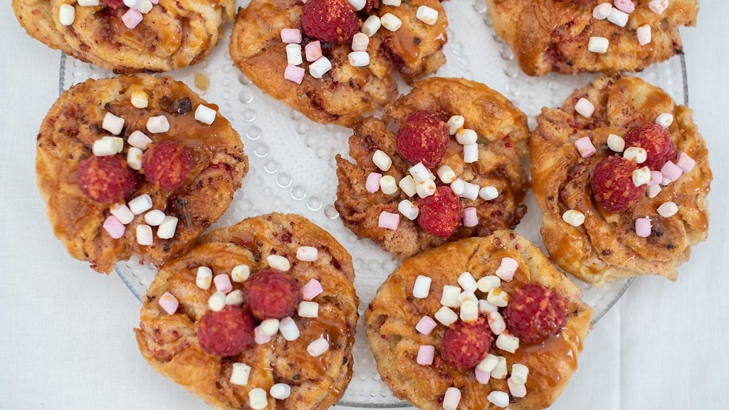 Voitele kananmunalla. Paista 225-asteisessa uunissa noin 15 minuuttia. Koristele kinuskilla, vadelmilla ja vaahtokarkeilla.