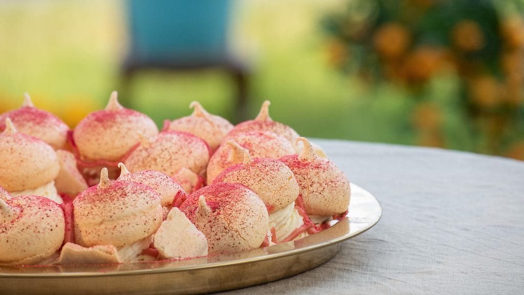 PAVLOVASUUKOT: Laita uuni kuumenemaan 100 asteeseen. Erottele keltuaiset valkuaisista apukuppia käyttäen ja lisää valkuaiset yleiskoneen kulhoon (jätä keltuaiset odottamaan). Vatkaa valkuaiset kovaksi vaahdoksi. Lisää kovaan vaahtoon sokeri vähitellen koko ajan vatkaten. Sekoita lopuksi joukkoon etikka, maissitärkkelys ja suola. Vatkaa, kunnes sokeri on sulanut (kokeile sormien välissä). Pursota pyöreän tyllan avulla 20 suukkoa. Levitä loppu marenki pellille. Ripottele pinnalle vadelmajauhetta ja paista 100 astetta 1,5 tuntia.