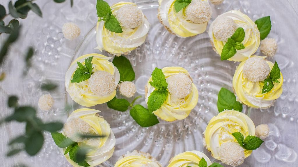 SVEITSILÄINEN MARENKI: Erottele kananmunista valkuaiset yksitellen lasiin, keltuaista ei saa tulla mukaan yhtään. Kippaa valkuaiset metalliseen kulhoon. Laita isoon kattilan pohjalle vettä kiehumaan ja nosta metallikulho kattilan päälle, vesi ei saa koskea kulhon pohjaan. Vatkaa valkuaisia vatkaimella ja lisää sokeria vähitellen sekaan koko ajan vatkaten. Vatkaa noin 10 min, mittaa digilämpömittarilla seoksen lämpötila 60 asteinen. Nosta metallikulho pois kattilan päältä, jatka hetki sekoittamista. Lisää rommiaromi hyvin sekoittaen. Ota pieni osa marengista pieneen kulhoon ja värjää se muutaman tipan avulla vaalean keltaiseksi. Laita pursotuspussiin Wiltonin 1M tylla, ja laita keltaista marenkia lusikalla 3 kohtaan pussin reunoille viivaksi. Lisää valkoinen marenki keskelle vähitellen lusikalla. Pursota marenki ruusuksi aloittaen leivoksen keskeltä edeten reunoihin. Aseta päälle kookosvalkosuklaakuula, ripottele kookoshiutaleita pinnalle ja aseta yksi mintunlehti koristeeksi