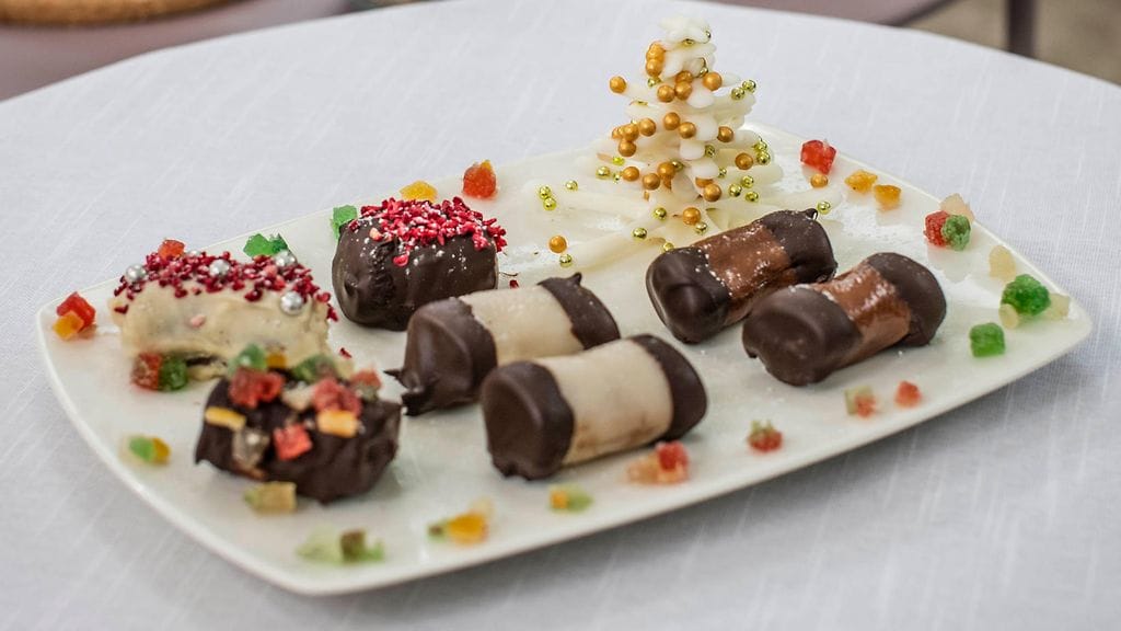 Marsipaanin värjääminen: kaulii levyksi, ripottelee kaakaojauhetta päälle, taittaa, lisää kaakaojauhetta, taittaa, kaulii uudelleen levyksi. (Värjääminen vain jos on aikaa). Laita kaulitun marsipaanilevyn päälle pitkä noin peukalonpaksuinen pötkö massaa, leikkaa sopivan kokoinen pala marsipaanista, taita rullaksi, ja jätä sauma rullan alle. Sulata suklaa vesihauteessa, dippaa päät, laita jääkaappiin viilenemään. Koristele.