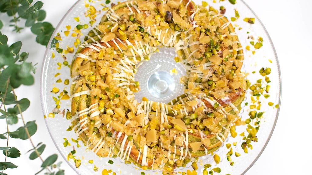 TOIMI NÄIN: Liota hiiva kädenlämpöiseen veteen ja lisää suola, sokeri, keltuaiset ja kardemumma. Sulata voi mikrossa miedolla lämmöllä. Lisää maitoseokseen pikkuhiljaa vehnäjauhoja ja vaivaa taikinakoukulla taikinaan hyvä sitko. Jätä hieman jauhoja jäljelle. Lisää voi alustuksen loppuvaiheessa ja lisää lopuksi jäljelle jääneet jauhot. Jatka taikinan vaivaamista vielä muutama minuutti. Kohota hetki uunissa, jonka pohjalla kiehuvaa vettä sisältävä kattila. Valmista sillä aikaa pistaasitahna.