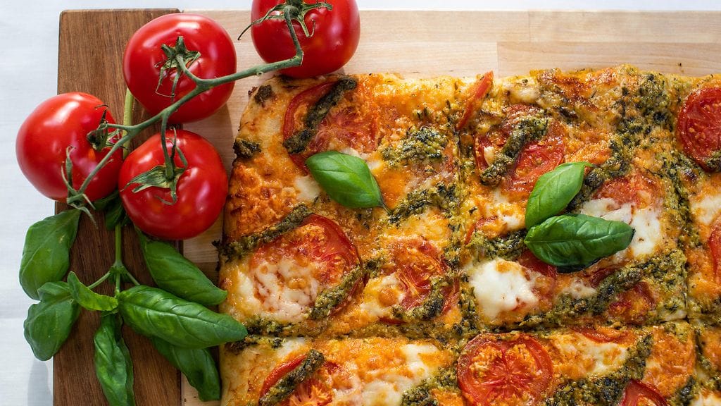 POHJA: Ota vedestä pieni osa erilliseen astiaan ja laita suola sinne sulamaan. Sekoita keskenään kuivahiiva ja jauhot. Lisää vettä pikkuhiljaa ja vaivaa taikinaa. Lisää taikinaan suolavesi ja jatka vaivaamista, kunnes vesi on imeytynyt osaksi taikinaa. Lisää taikinaan öljy ja jatka vaivaamista vielä muutamia minuutteja. Laita kulhon päälle kelmu ja leivinliina, jotta saat siitä mahdollisimman ilmatiiviin. Jätä taikina kohoamaan 60 minuutiksi.