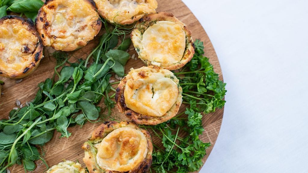 POHJA: Liuota hiiva kädenlämpöiseen veteen. Lisää suola, jauhot ja öljy. Sekoita tasaiseksi. Alusta pizzataikinaa muutama minuutti. Alustamisen keskellä, jaa taikina kahteen osaan ja lisää toiseen taikinaan silputtu persilja ja toiseen silputtu basilika. Alusta loppuun. Anna kohota liinan alla lämpimässä ja vedottomassa paikassa, kunnes taikina on kaksinkertainen (vähintään 30 minuuttia). Kauli taikina ohueksi pizzapohjaksi. Voitele alumiiniset (tai muut tukevat) muffinivuoat ja painele pizzapohja niiden reunoille.