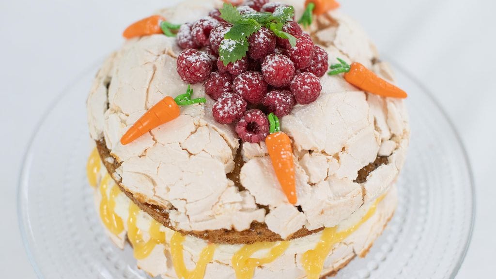MARENKI: Erottele valkuaiset. Vatkaa valkuaiset kovaksi vaahdoksi ja lisää loppuvaiheessa sokerit vähitellen. Jatka vatkaamista, kunnes vaahto on kiiltävää. Lisää sitruunan kuoriraaste ja sekoita vielä. Levitä marenkivaahto porkkanakakkupohjien päälle. Paista pohjia uunissa 175 asteessa n. 30 minuuttia kunnes porkkanakakkupohja on kypsää ja marenki rapeaa. Jäähdytä pohjat.
