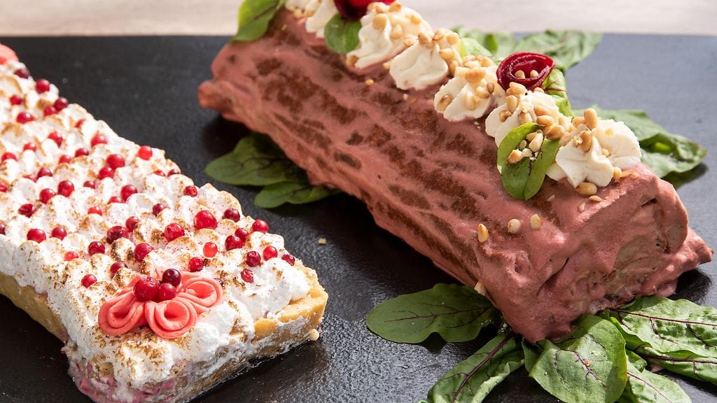 KÄÄRRETORTUN KOKOAMINEN: Levitä jäähtyneen pohjan päälle ohut kerros punajuuripestoa. Levitä peston päälle päärynä-auramousse. Rouhi paahdetut pinjansiemenet ja viinisuolaheinä-yritti. Ripottele moussen päälle siemenet ja yrtti. Rullaa kääretorttu ja nosta tarjoiluastialle. Pursota aiemmin säästettyä täytettä kääretortun keskelle köynnökseksi ja ripottele päälle siemeniä ja yrttejä.