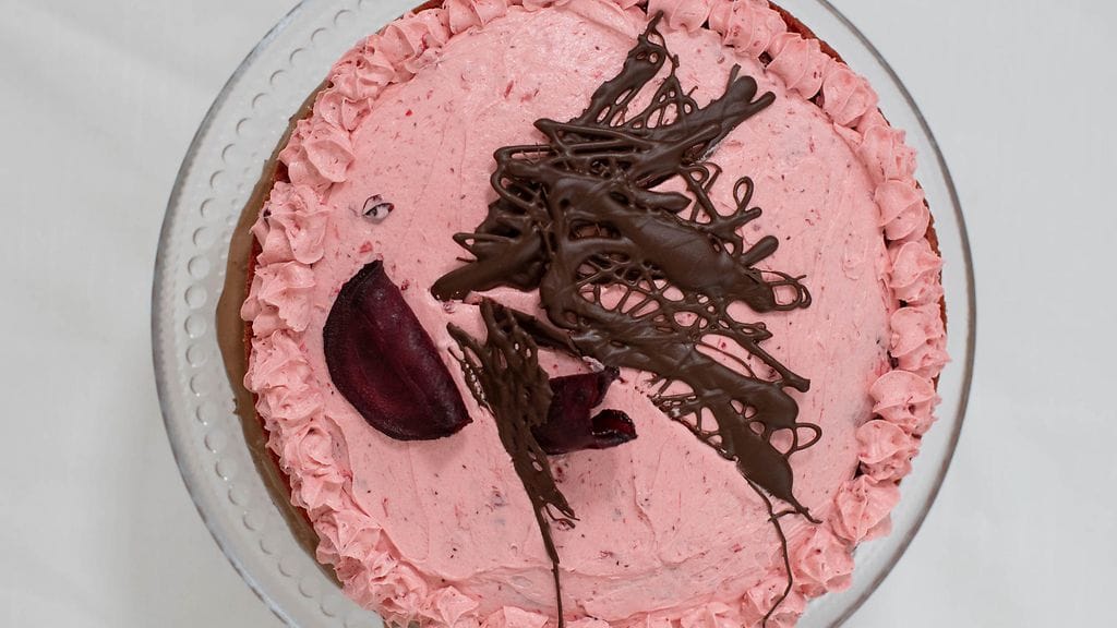 POHJA: Vaahdota sokeri ja kananmuna. Lisää kuivat aineet, punajuuriraaste, maito ja voisula. Kaada vuokaan, paista.