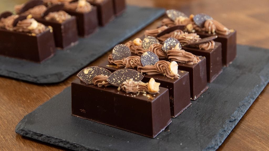 SUKLAAKUORET: Tarkista, että silikonimuotit ovat kuivat ja puhtaat. Temperoi suklaa; pilko suklaa. Sulata 2/3 osa suklaata noin 45 asteiseksi. Lisää loput suklaat ja jäähdytä koko ajan liikuttaen ja sekoittaen (ei vatkaten) niin, että suklaa on 26 – 28 asteista. Lämmitä lopuksi käyttölämpötilaan noin 30 – 32 asteiseksi. Kaada suklaa muotteihin ja anna olla hetken aikaa ja liikuttele muottia, jotta suklaata tulee joka puolelle tasaisesti. Kaada ylimääräinen suklaa pois, siisti muotti ja jätä kuoret kovettumaan. Osasta suklaasta voit tehdä tässä vaiheessa koristeita suklaapatukan päälle joko spritsaamalla, valamalla tai levittämällä.