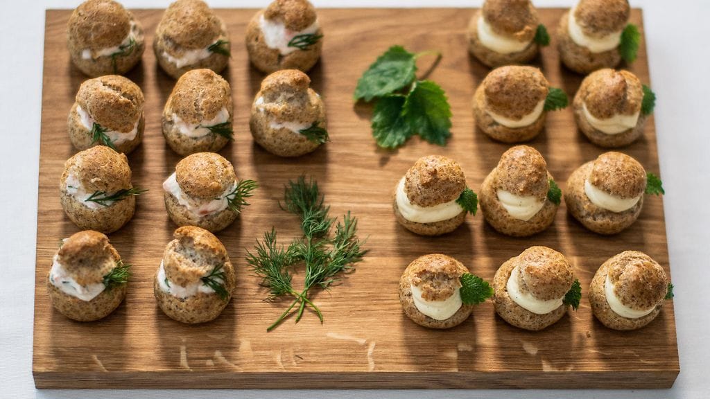 RUISTUULIHATUT: Kiehauta voi ja vesi. Lisää jauhot ja sekoita hyvin. Lisää kananmunat yksitellen vatkaimella sekoittaen. Lisää leivinjauhe. Pursota pieniä tuulihattuja leivinpaperille. Paista keskitasolla 200 asteessa n. 25 min.