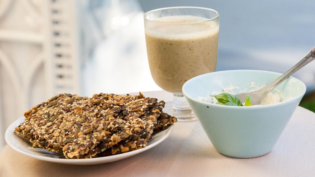 2. Lisää vesi ja oliiviöljy, sekoita tasaiseksi. Murskaa valkosipulit ja hienonna ne, sekä yrtit silpuksi. Sekoita massan joukkoon.