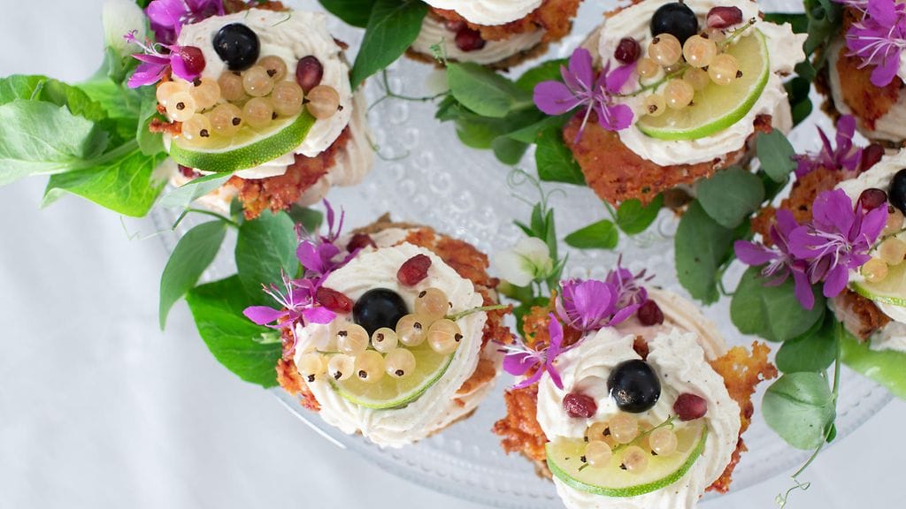LEIPÄ: Lämmitä mehu kädenlämpöiseksi ja liota hiiva joukkoon. Lisää suola, siirappi, maltaat, ruisjauhot, auringonkukan ja sekoita tasaiseksi. Lisää vehnäjauhot pikkuhiljaa ja sekoita. Ripottele taikinan päälle hieman jauhoja ja laita kohoamaan n. 30min. Vaivaa kohonnut taikina ja levitä voidellun leivinpaperin päälle. Anna hetki kohota. Laita pelti uuniin ja paista n. 20 min. Kostuta valmis leipälevy ja anna hetki vetäytyä. Paina muotilla 10 kpl leivospohjia ja halkaise ne varovasti. Anna jäähtyä.