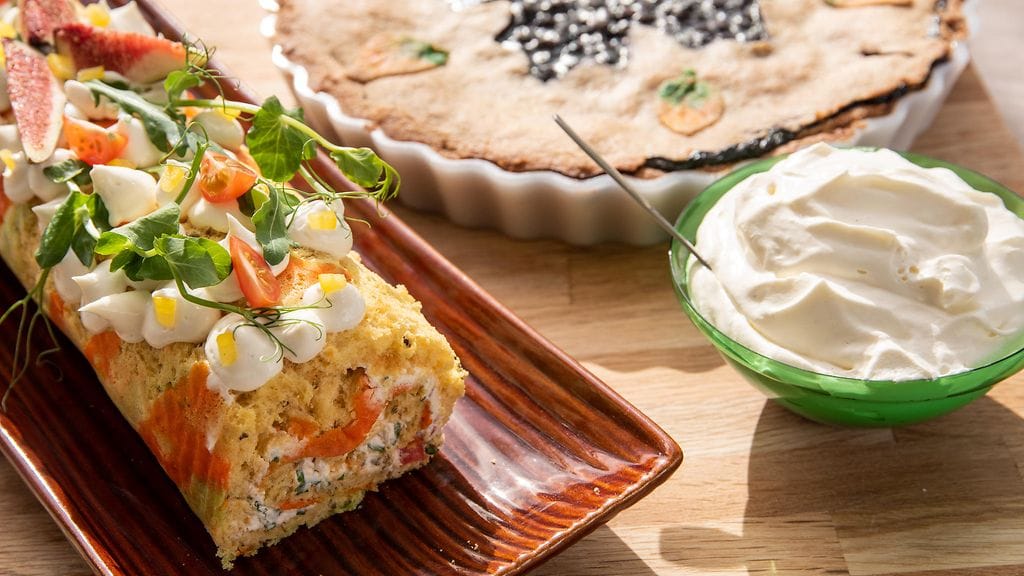 KÄÄRÄRIN KORISTELU: Nosta kääräri tarjoilulautaselle. Sekoita tuorejuusto ja majoneesi yhteen tasaiseksi, mausta oreganolla, suolalla ja mustapippurilla maun mukaan. Laita kuorrute pursotinpussiin, jossa on pyöreä tylla. Pursota kääretortun päälle kuorrute”palloja”. Koristele kääräri herneenversoilla, rucolalla, viikunalla, paprikasilpulla, kirsikkatomaatilla ja mustapippurilla.