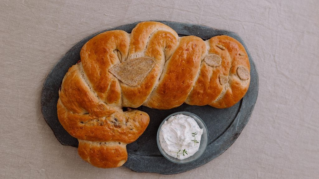 LEIPÄTAIKINA: Lämmitä maito kädenlämpöiseksi, murenna hiiva joukkoon ja sekoita. Sekoita joukkoon suola, hunaja ja kananmuna. Lisää jauhot osissa ja alusta taikinaa monitoimikoneella tai käsin. Lisää öljy ja loput jauhot. Jätä taikina peitettynä lepäämään 15 minuutiksi.