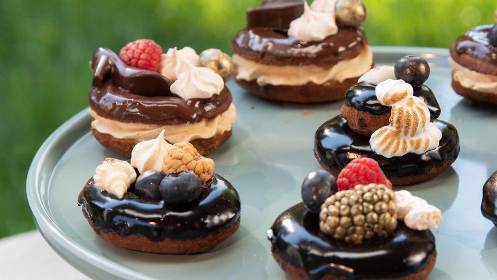 Kerrosdonitsit: 2 kpl Dippaa kaksi normaalikokoista ja kaksi minidonitsia salmiakkipomadaan. Nosta pienet donitsit isompien päälle. Koristele donitsit suklaakoristeilla ja marjoilla. Pursota ylijäämä marenkia donitseille ja polta marengin pinta butaanipolttimella.