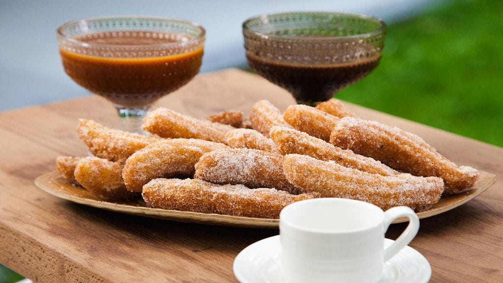 Valmista ensin taikina. Mittaa kattilaan vesi, voi, suola ja sokeri. Kiehauta seos ja lisää kerralla vehnäjauhot, joihin kardemumma sekoitettuna. Vatkaa seosta voimakkaasti kunnes taikina alkaa irrota kattilan reunoista. Sammuta levy, ja anna taikinan jäähtyä hetki ja kääntele samalla. Siirrä taikina kulhoon ja vatkaa sähkövatkaimella hieman taikinaa.Lisää lopuksi joukkoon munat yksitellen hyvin vatkaten. Siirrä taikina pursotin pussiin, jossa suora tähtitylla. Laita öljy kuumenemaan 180 asteeseen. Voit käyttää apuna digitaalista paistomittaria. Pursota kuumaan öljyyn n.5-7 cm taikina pötköjä ja paista ne kauniin ruskeiksi n. 2-3 min. Nosta kypsät churrot reikäkauhalla talouspaperin päälle. Pyörittele sen jälkeen sokeri-kaneliseoksessa ja lado vadille jäähtymään.