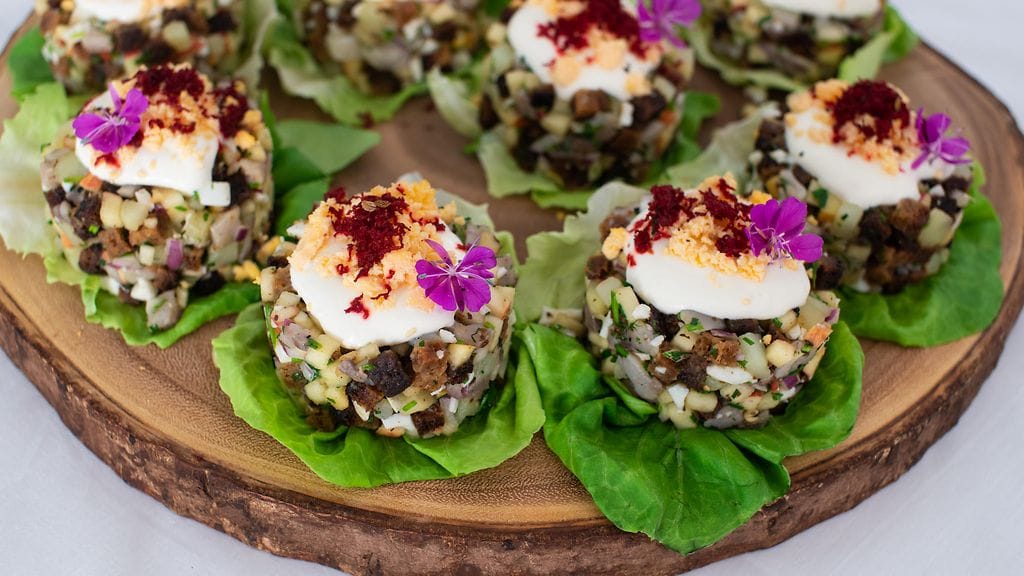 Vatkaa ranskankerma vaahdoksi. Jaa isot salaatinlehdet tarjoiluastialle. Lusikoi voileipäkakkua muottiin, paina ”männällä” tasaiseksi ja tiiviiksi, nosta sitten muotti pois. Tee näin kaikki leivokset. Pursota koristeeksi ranskankermaa. Lisää pinnalle vielä hienonnettua keltuaisesta ja pippurirouhetta.
