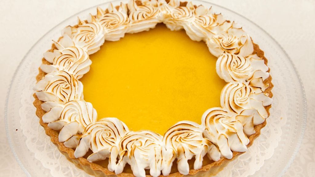 6. Vatkaa valkuaiset. Valmista italialainen marenki. Pursota italialainen marenki sitruunatäytteen päälle. Polta marenki kaasupolttimella.