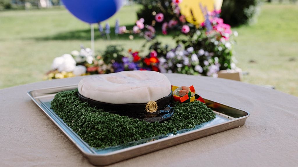 Tee lippa mustasta sokerimassasta. Sekoita joukkoon CMC-jauhetta, jotta se kovettuu muotoonsa nopeammin. Käytä muodon tukena kuivumisen ajan esim. foliota ja reunakalvoa. Kuivumisen jälkeen sivele lipan pintaan glukoosisiirappia siveltimellä.Tee lakin lyyra-kokardi valkoisesta sokerimassasta ja värjää se kultatomulla siveltimen avulla. Viimeistele alla oleva kakkupohja levittämällä vihreää voikreemiä ja tuputtamalla päälle vihreää kakkumurua ikään kuin ruohoksi tai sammaleeksi. Viimeistele lakki värjäämällä ja muotoilemalla aidon näköiseksi. Käytä värjäämiseen