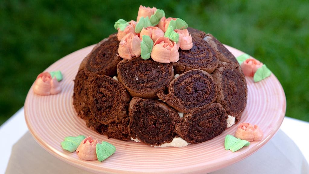 Valmista kääretorttutaikina. Vatkaa huoneenlämpöiset munat ja sokeri vaahdoksi. Sekoita kuivat aineet keskenään. Lisää jauhoseos munavaahtoon siivilän läpi varovasti sekoittaen. Levitä taikina uunipellille ja paista 225 asteessa 8min. Kumoa kypsä levy leivinpaperin päälle ja anna jäähtyä kostean liinan alla. Levitä jäähtyneelle kääretortulle kirsikkahillo ja rullaa torttu.