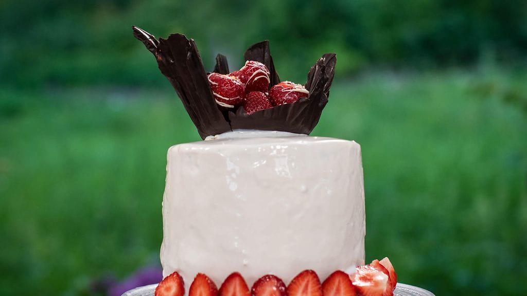 KORISTEET: Aloita temperoimalla 150 g tummaa suklaata. Pilko suklaa kulhoon ja sulata se kuumassa vesihauteessa 48-50 asteiseksi. Jäähdytä seos kylmässä vesihauteessa 27-28 asteiseksi ja sen jälkeen lämmitä kuuman vesihauteen yllä 31-32 asteiseksi. Asettele pöydälle nurinpäin esimerkiksi kapea leivontakulho ja laita sen päälle tuorekelmua. Kaada temperoitu suklaa kulhon pohjan päälle ja anna valua. Laita suklaa jähmettymään kylmään. Sulata loput tummasta suklaasta ja valkosuklaa. Pese tuoreet mansikat. Pursota mansikoiden päälle valkosuklaaraitoja. Laita mansikat jähmettymään kylmään. Halkaise loput mansikat neljään osaan ja asettele ne kehäksi kakun alareunaan. Asettele temperoitu ja jähmettynyt suklaakruunu kakun päälle ja laita sen sisälle suklaamansikoita.